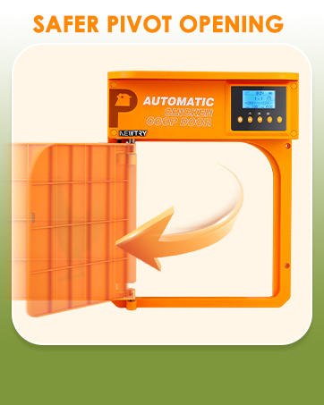 Unser Türöffner kommt mit einem fortschrittlichen Schwenktür-Design, das sich ideal für unterschiedlichste Hühnerställe eignet, selbst bei niedrigen Deckenhöhen. Die langsame Drehbewegung beim Schließen schützt Ihre Tiere vor Verletzungen und sorgt für einen sanften Zugang.