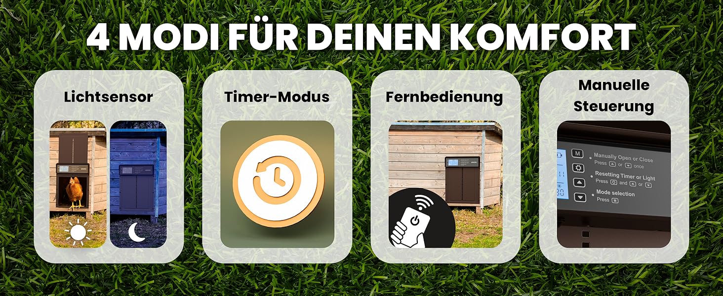 • Sicherheitstechnologie: Die Einklemmschutz-Technologie schützt Ihre Hühner und gewährleistet eine sichere Automatisierung.
