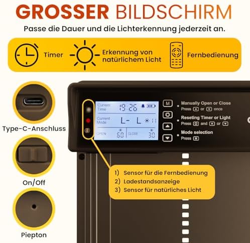 Der integrierte LCD-Bildschirm zeigt alle wichtigen Informationen in Echtzeit an. Die Fernbedienung ermöglicht eine einfache und schnelle Anpassung der Einstellungen bis zu einer Entfernung von 15 Metern. So können Sie stets die Kontrolle über Ihre Hühnerklappe behalten und Ihre Abläufe effizienter gestalten.