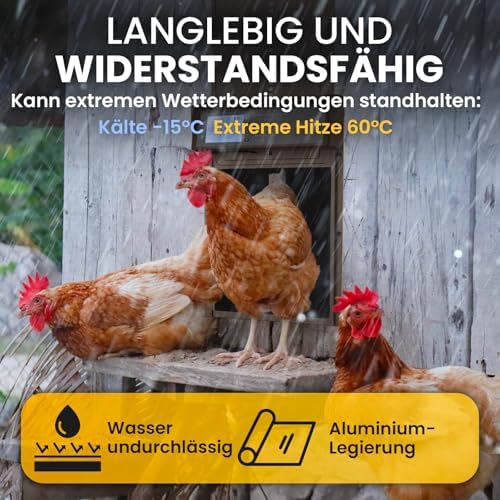 Hergestellt aus einer langlebigen Aluminiumlegierung und hochbeständigem ABS-Kunststoff, trotzt die Hühnerklappe extremen Witterungsbedingungen. Egal ob Hitze, Kälte, Regen oder Schnee – diese Hühnerklappe funktioniert zuverlässig bei Temperaturen von -15°C bis 60°C. Sie ist somit das perfekte Zubehör für jeden Hühnerstall und bietet eine langfristige Lösung für Ihre Tierhaltung.