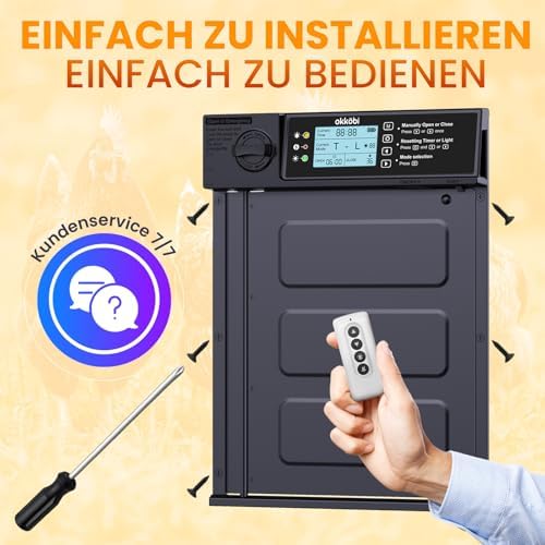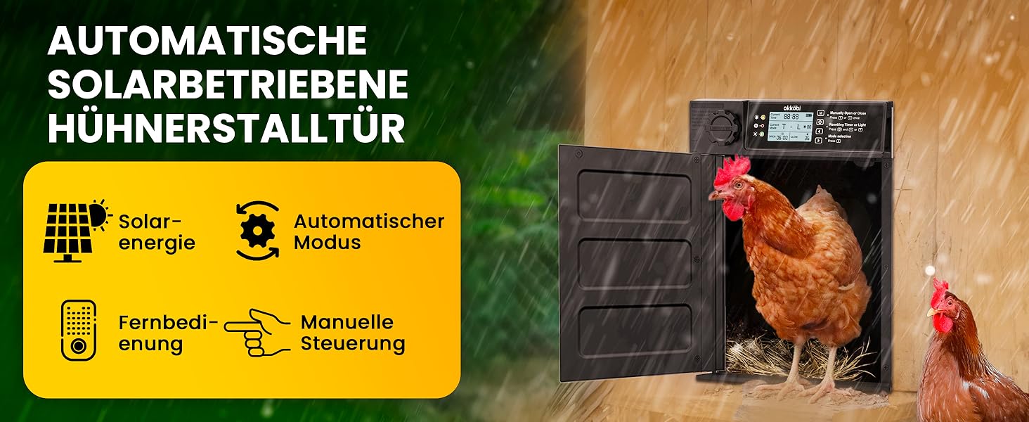 Okkobi Automatische Hühnerklappe Solar PRO – Mit Fernbedienung, Lichtsensor & Timer für sicheren Komfort im Hühnerstall