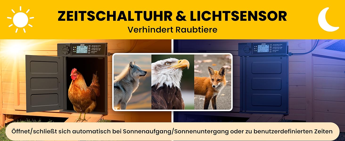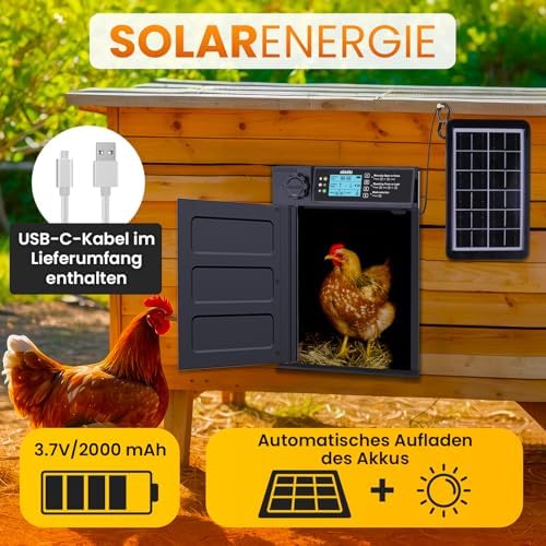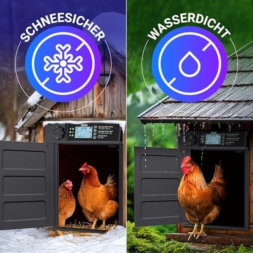 • Automatische Öffnungs- und Schließfunktion: Lassen Sie Ihre Hühner bei Sonnenaufgang und -untergang selbstständig ein- und ausfliegen, ohne manuelles Eingreifen.