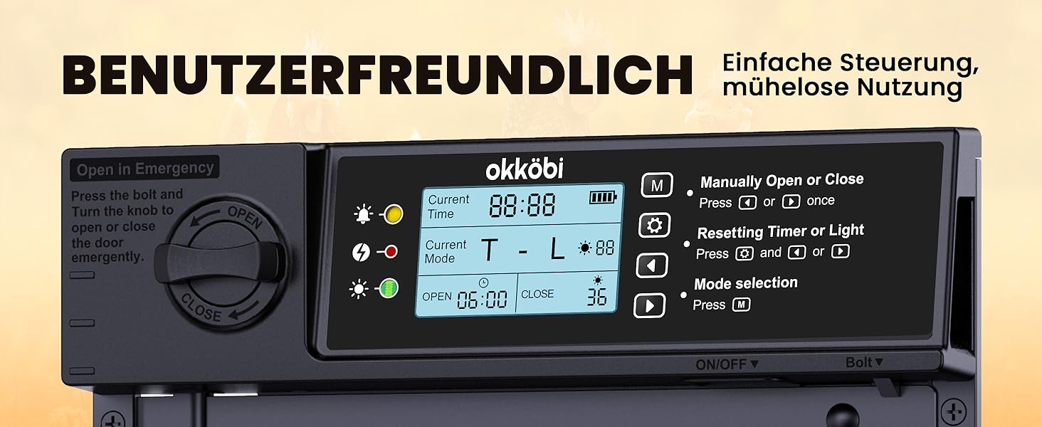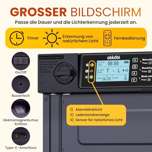 Okkobi Automatische Hühnerklappe Solar PRO - Mit Fernbedienung, Lichtsensor & Timer für sicheren Komfort im HühnerstallOkkobi Automatische Hühnerklappe Solar PRO – Mit Fernbedienung, Lichtsensor & Timer für sicheren Komfort im Hühnerstall