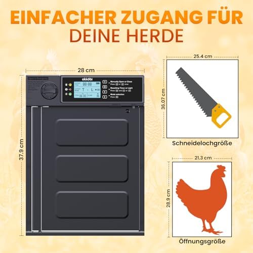 Mit einer großzügigen Öffnung von 38 x 28 cm ist die Klappe für die meisten Hühnerställe und verschiedene Geflügelarten bis zu 5 kg geeignet, darunter Enten, Gänse und sogar Kaninchen. Die Installation ist denkbar einfach und schnell in weniger als 10 Minuten erledigt, sodass Sie sofort von den Vorteilen profitieren können.