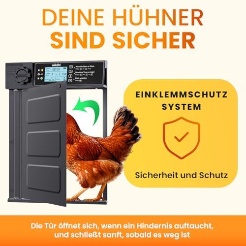 Dank der innovativen Einklemmschutz-Technologie öffnet sich die Tür automatisch, wenn ein Widerstand beim Schließen festgestellt wird. Diese Funktion bietet Ihnen die Gewissheit, dass Ihre Hühner immer sicher sind. Darüber hinaus können Sie individuelle Öffnungs- und Schließzeiten programmieren oder den integrierten Lichtsensor nutzen, um das Öffnen und Schließen automatisch bei Sonnenlicht zu steuern.