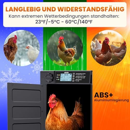 Die Hühnerklappe besteht aus einer robusten Aluminiumlegierung und hochwertigem ABS-Kunststoff. Diese Materialien gewährleisten, dass die Klappe selbst bei extremen Wetterbedingungen von -5°C bis 60°C zuverlässig funktioniert. Egal ob Sturm, Regen, Schnee oder Sonnenschein, Ihre Hühnerklappe bleibt einsatzbereit und schützt Ihre Tiere rund um die Uhr.