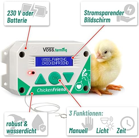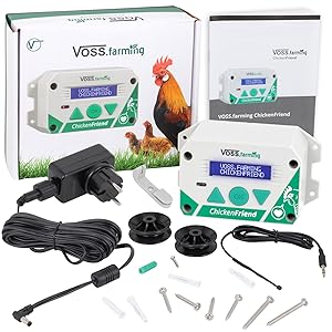 Die VOSS.farming ChickenFriend Steuerung überzeugt durch die Verwendung robuster Materialien, die auf Langlebigkeit und Funktionalität ausgelegt sind. Die kompakte Bauweise und das beleuchtete Display ermöglichen eine einfache Bedienung, selbst bei schlechten Lichtverhältnissen. Die deutschsprachige Bedienungsanleitung sorgt dafür, dass Sie schnell und unkompliziert alle Funktionen verstehen und nutzen können.